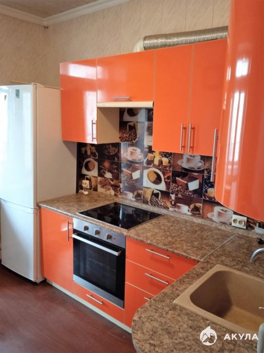 Полностью оборудованная кухня: холодильник, плита с 4 конфорками, духовка, микроволновка, электрический чайник, небольшой набор посуды.